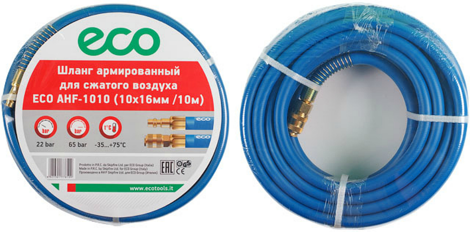 Шланг армированный ECO AHF-1010 с быстросъемными соединениями ПАПА и МАМА предназначен для подключения сжатого воздуха к пневмоинструменту и оборудованию
