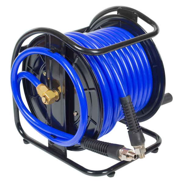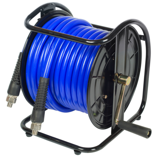 - Конструкция позволяет разместить шланг на рабочем месте так, как вам удобно, а по окончании работы свернуть шланг и перенести раму с катушкой на место хранения.