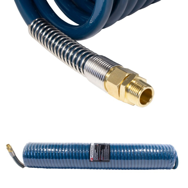 Шланг витой полиуретановый Forsage F-1208-5M с быстроразъемами, предназначен для подключения сжатого воздуха к пневмоинструменту и оборудованию.
