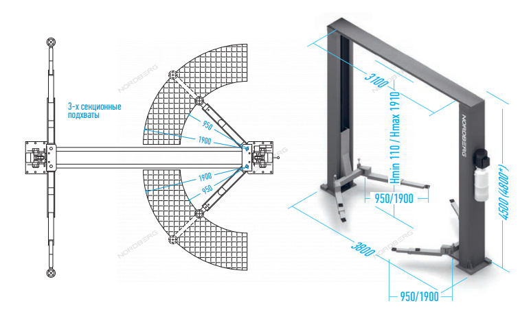 Сверхмощный двухстоечный подъемник Nordberg N4122H-6T с 2 мощными цилиндрами и с комплектом резьбовых проставок 30 и 100 мм для рамных авто