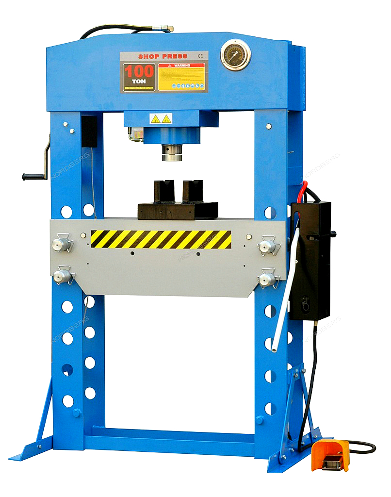 Напольный гидравлический пресс Nordberg N36100A с пневматическим приводом укомплектован защитным клапаном от превышения давления, поперечным перемещаемым столом, механической ручной лебедкой для перемещения стола и V-образным блоком.