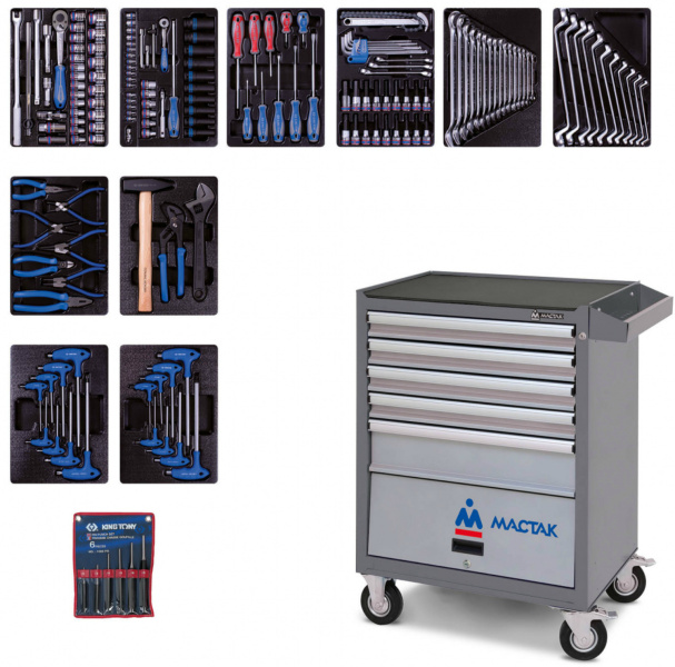 Инструментальная тележка с инструментом King Tony 932-000AMG из 10 ложементов (173 предмета) предназначена для организации рабочего места в любом производственном помещении, станции технического обслуживания или авторемонтной мастерской.