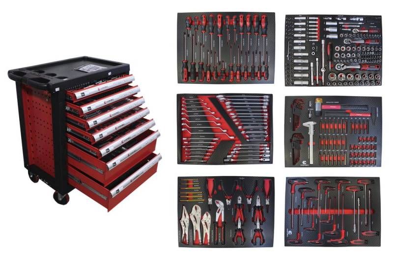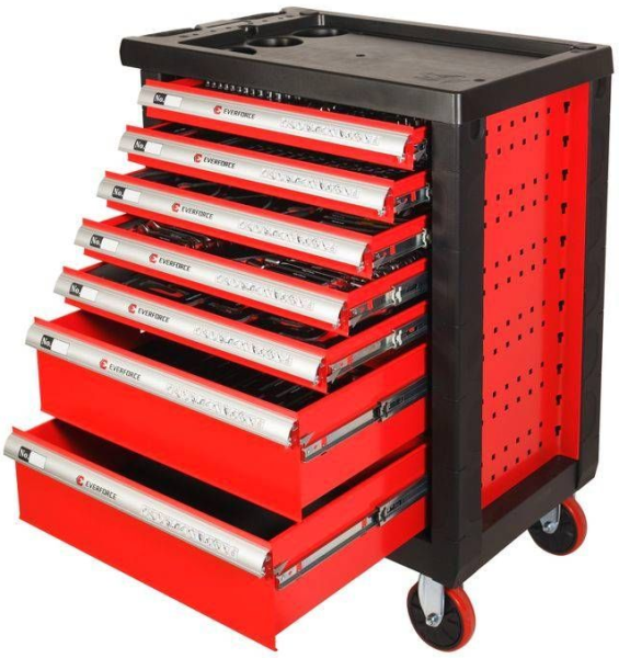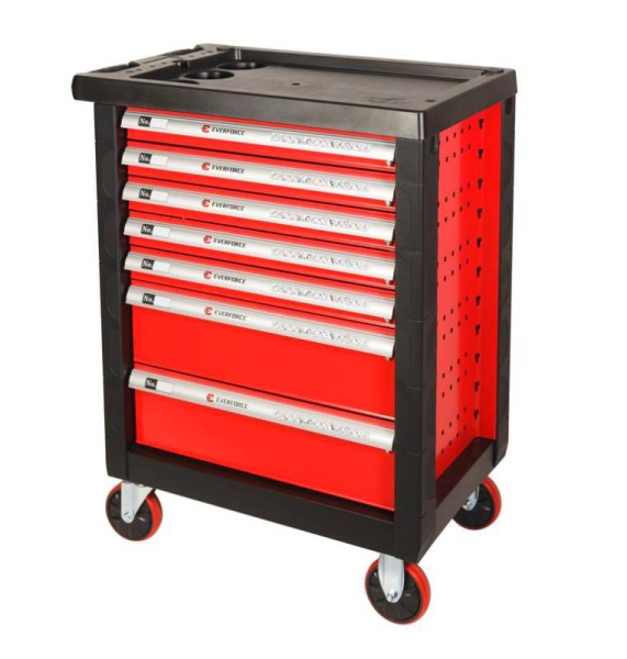 Тележка инструментальная 7-и полочная(красная) Everforce EF-2202 с набором инструментов из 335(333) с пластиковой защитой корпуса и дополнительной с 2 сторон перфорацией 970х770х460 мм, предназначена для организации рабочего места в любом производственном помещении СТО или авторемонтной мастерской.