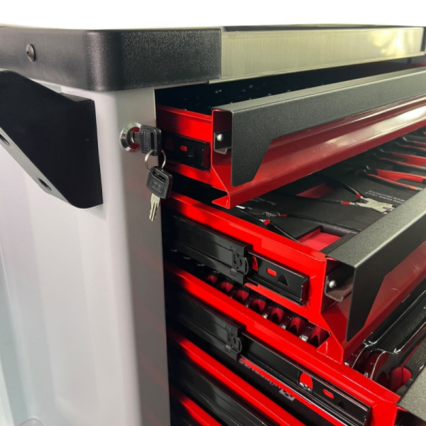 - Телескопические направляющие ящиков имеют механизм фиксации, не позволяющий самопроизвольно открыться ящику, даже если внутри находится инструмент, а также доводчиком, обеспечивающим плавное закрытие ящика.