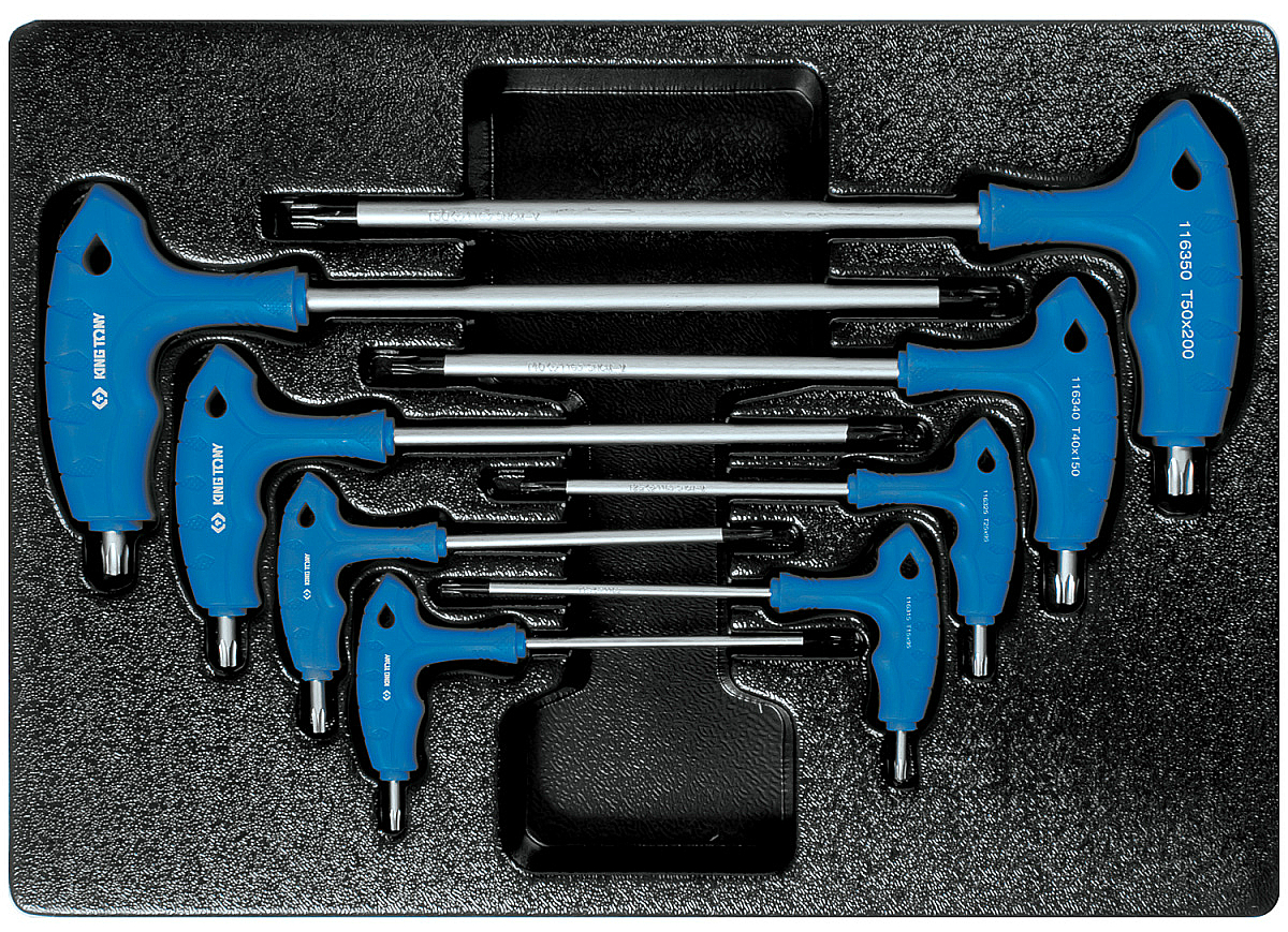Набор L-образных ключей TORX King Tony 9-22308PR в ложементе ПВХ (поливинилхлорид) из 8 предметов, предназначен для комплектации передвижных инструментальных тележек или слесарных верстаков.