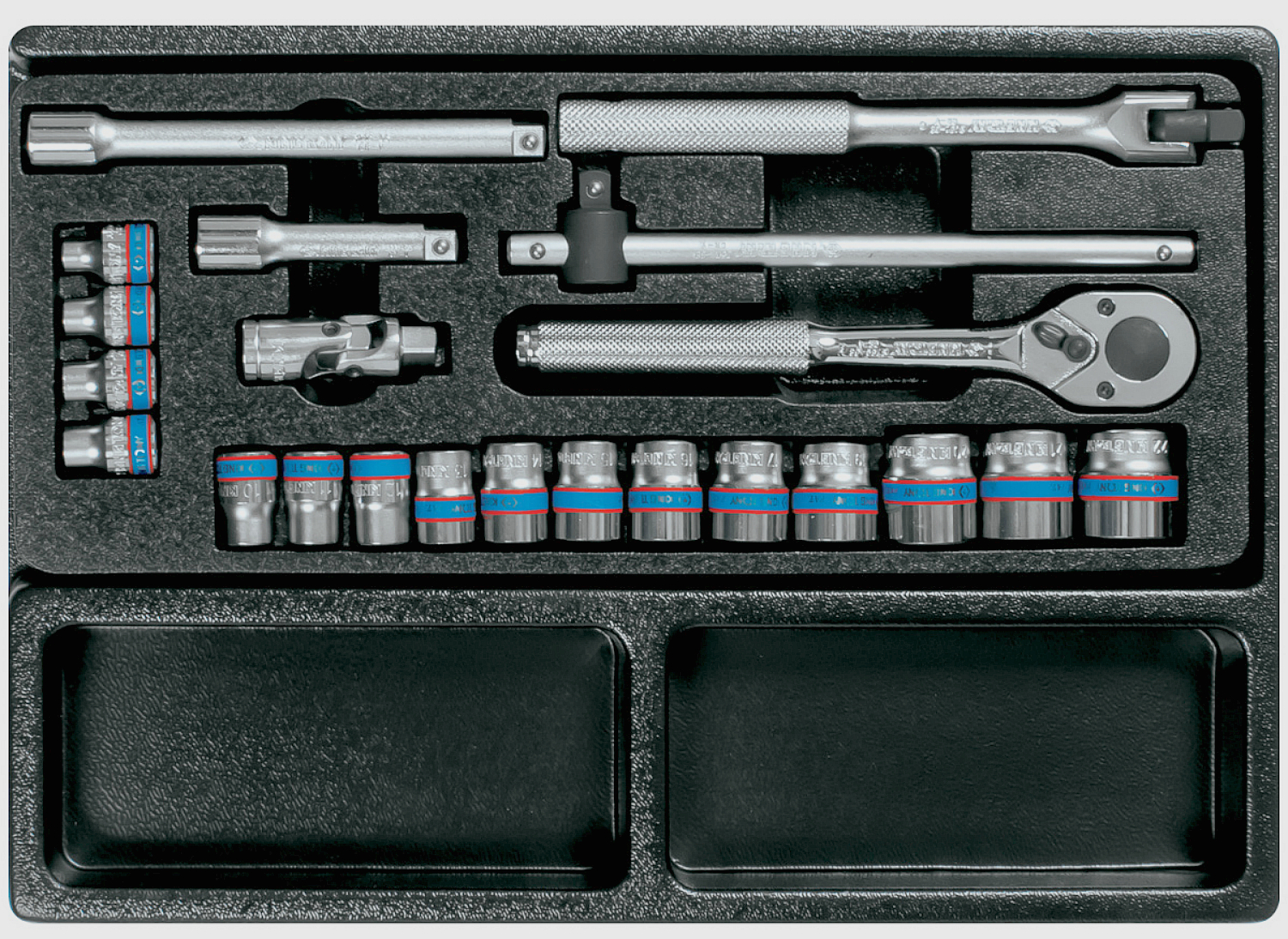 Набор торцевых головок 3/8" с принадлежностями King Tony 9-3523MR в ложементе из материала PVH (поливинилхлорида) из 23 предметов, предназначен для комплектации передвижных инструментальных тележек или слесарных верстаков.