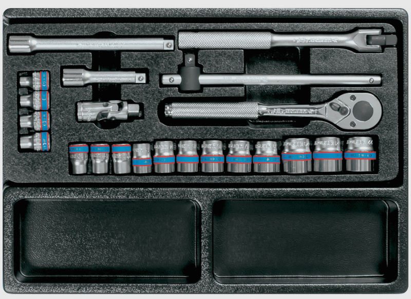 Набор торцевых головок 3/8" с принадлежностями King Tony 9-3523MR в ложементе из материала PVH из 23 предметов, предназначен для комплектации инструментальных тележек и слесарных верстаков.
