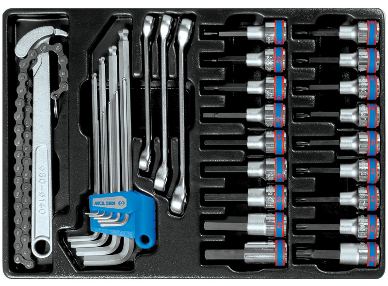 Набор торцевых насадок, шестигранники Г-образные и разрезные ключи King Tony 9-90131MR в ложементе ПВХ (поливинилхлорид) из 31 предмета, , предназначен для комплектации передвижных инструментальных тележек или слесарных верстаков.