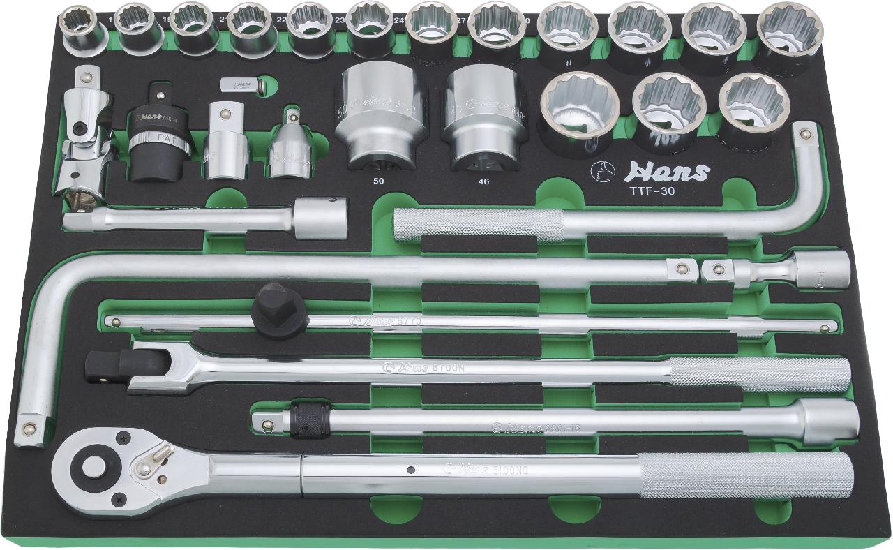 Ложемент 3/4" с набором головок и аксессуары Hans TTF-30 из 30 предметов, предназначен для оснащения инструментальной тележки на предприятиях , автосервисах и автомобильных мастерских.
