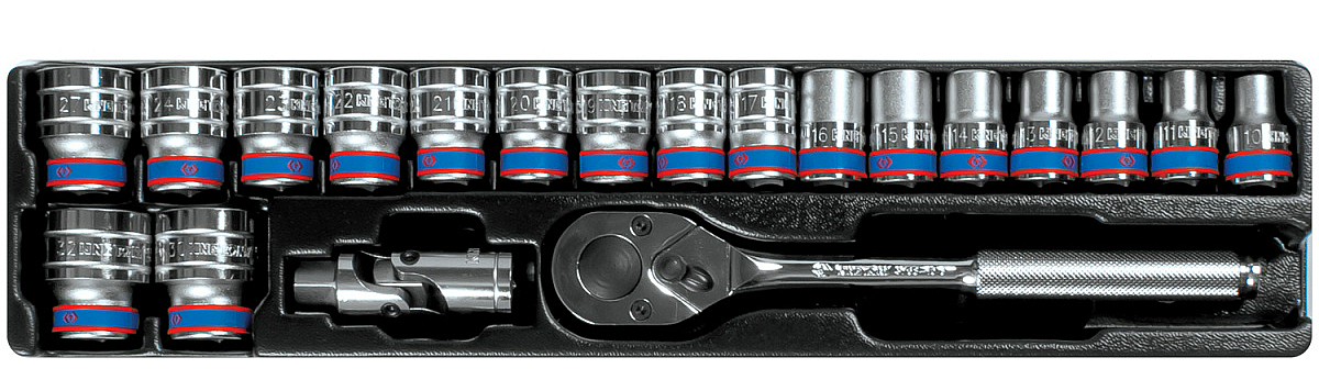 Набор торцевых головок с принадлежностями King Tony 9-4319MR в ложементе из материала PVH (поливинилхлорида) из 20 предметов, предназначен для комплектации передвижных инструментальных тележек или слесарных верстаков.