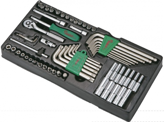 Торцевые головки и аксессуары Hans TT-43 из 62 предметов, предназначен для оснащения инструментальных тележек и как дополнительный инструмент для дома для мелких работ.