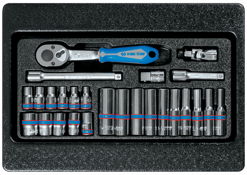 Набор торцевых головок с принадлежностями King Tony 9-2526MR в ложементе ПВХ (поливинилхлорид) из 26 предметов, предназначен для комплектации инструментальных тележек, ящиков и верстаков.