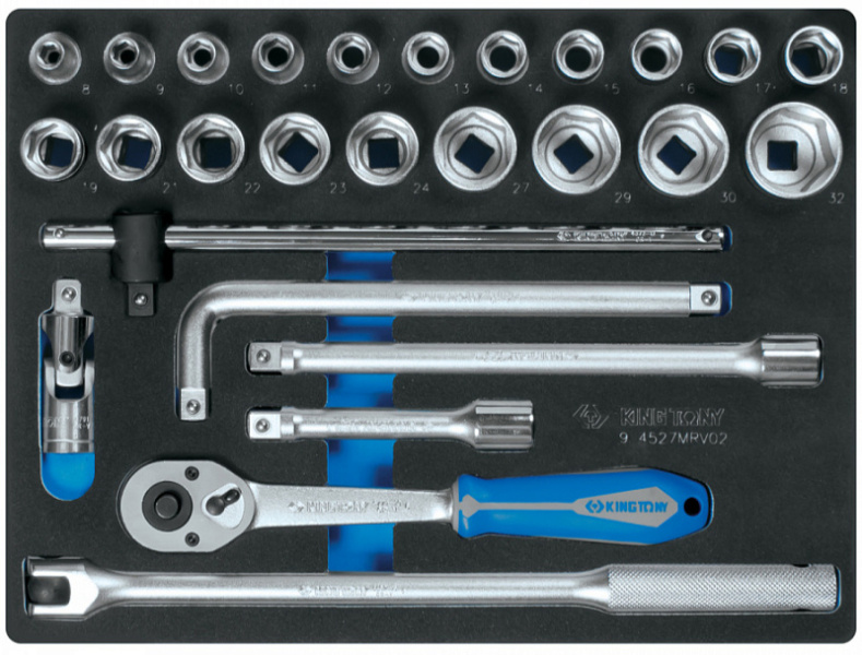 Набор торцевых головок с принадлежностями King Tony 9-4527MRV02 в ложементе EVA (ЭВА, полимер на основе этилена и винилацетата) из 27 предметов, предназначен для комплектации инструментальных тележек.