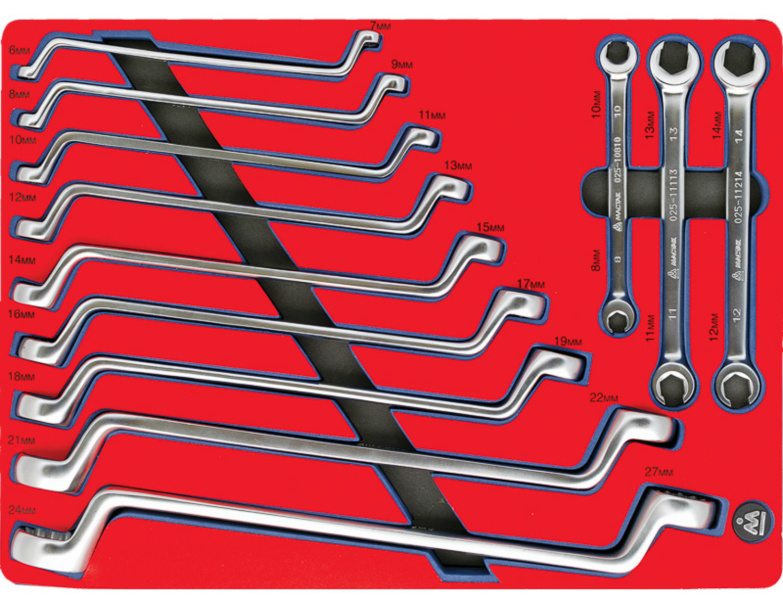 Набор накидных и разрезных ключей Мастак 5-23112 из 12 предметов в ложементе, предназначен для комплектации передвижных инструментальных тележек или слесарных верстаков при создании индивидуальных рабочих мест на станциях технического обслуживания. Производитель: Мастак (Тайвань)