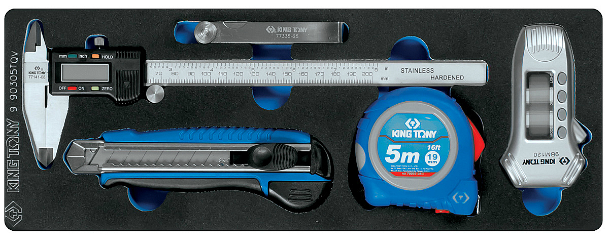 Набор измерительных инструментов King Tony 9-90305TQV в ложементе EVA (ЭВА, этиленвинилацетат) из 5 предметов, предназначен для комплектации передвижных инструментальных тележек или слесарных верстаков.
