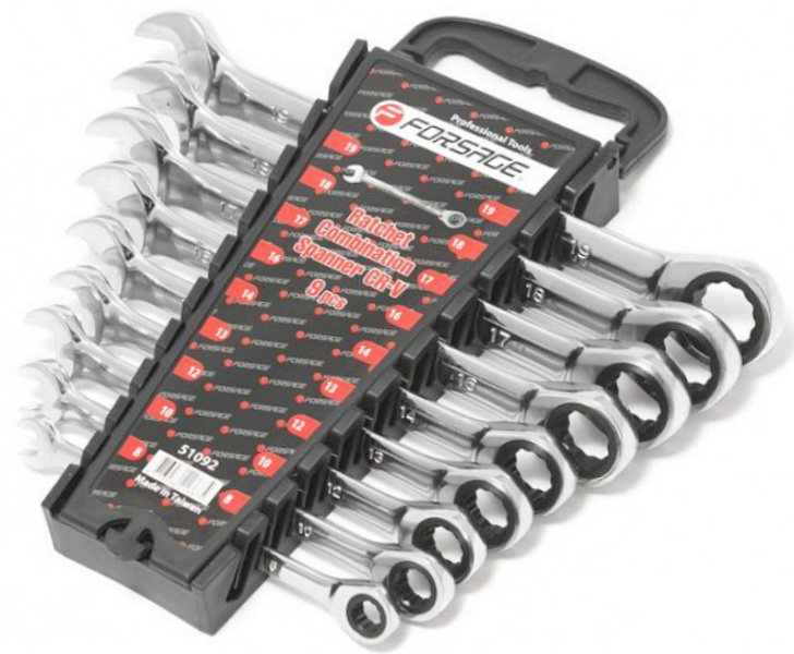 Набор трещоточных ключей Forsage F-51092 из 9 предметов, предназначен для монтажа или демонтажа резьбовых соединений.