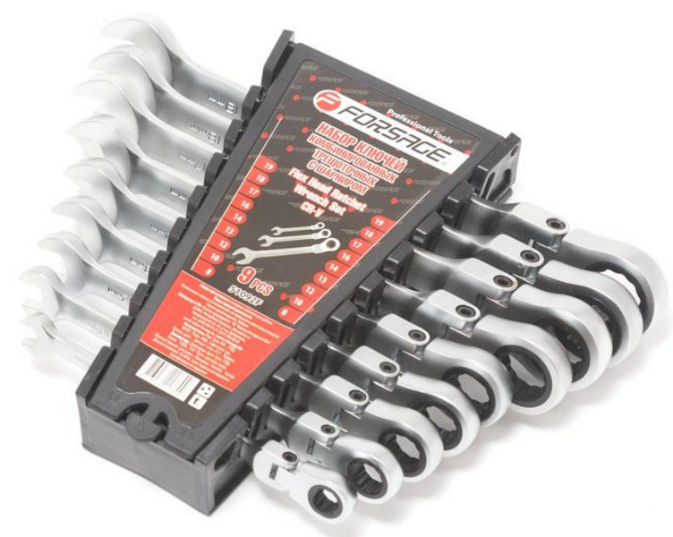 Набор ключей комбинированных трещоточных с шарниром Forsage F-51072F из 7 предметов, предназначен для монтажа или демонтажа резьбовых соединений.