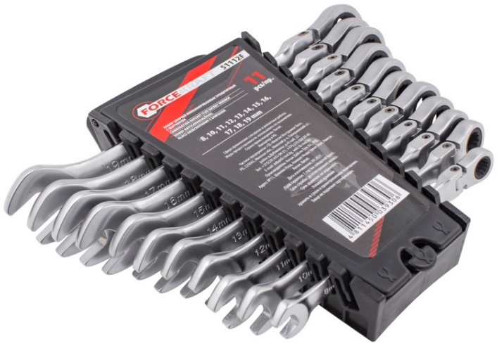 Набор ключей комбинированных трещоточных с шарниром ForceKraft FK-51112F (артикул 51234) в пластиковом держателе из 11 предметов, применяется в различных видах работ связанных с монтажем и демонтажем креплений.