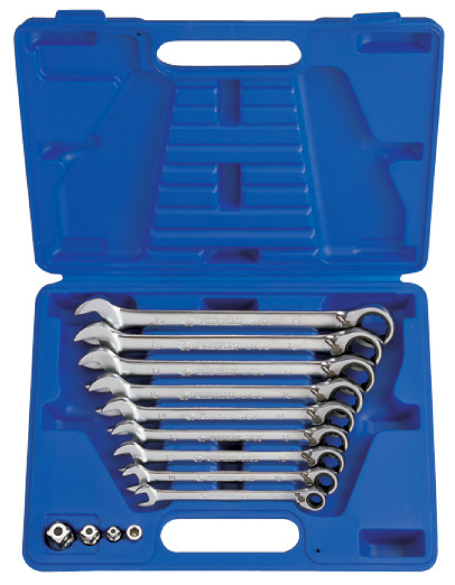 Набор ключей трещоточных комбинированных с флажковым переключателем и адаптерами King Tony 13213MR из 13 предметов используется в различных видах работ с резьбовыми соединениями.