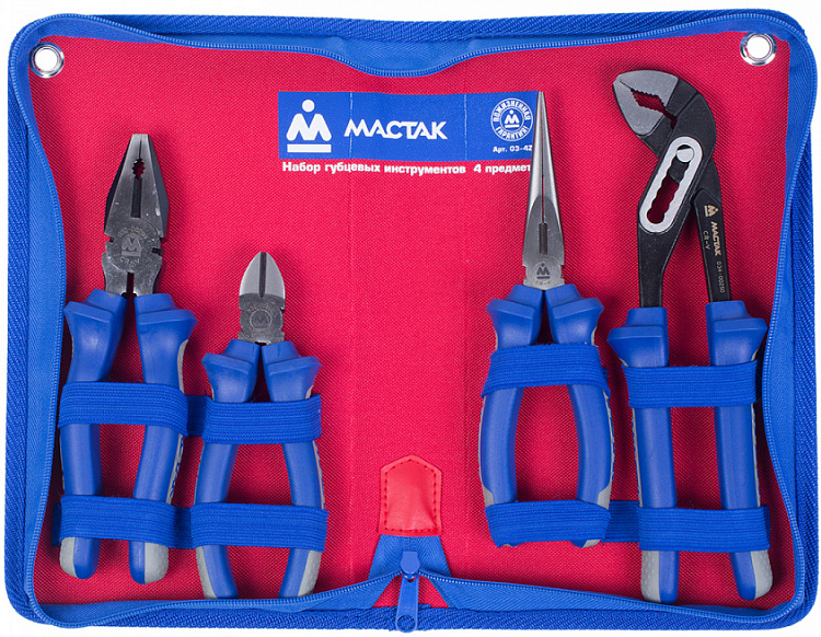 Набор шарнирно-губцевого инструмента Мастак 03-4Z в футляре из 4 предметов, предназначен для монтажа и демонтажа крепёжных узлов различных изделий, устройств и агрегатов. Производитель: Мастак (Тайвань)