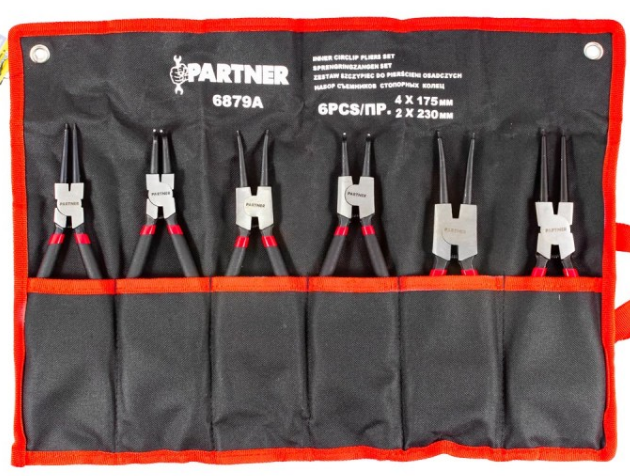 Набор съемников стопорных колец Partner PA-6879A (артикул 6720) на полотне из 6 предметов, используется для демонтажа внешних и внутренних стопорных колец.
