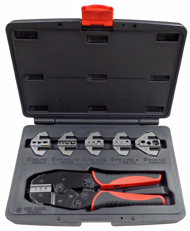 Кримпер храповичный для обжима изолированных наконечников из 7 предметов в кейсе Мастак 106-40007C, применяется в СТО, автомастерские, промышленное и бытовое применение, для обжима клемм разной конфигурации.