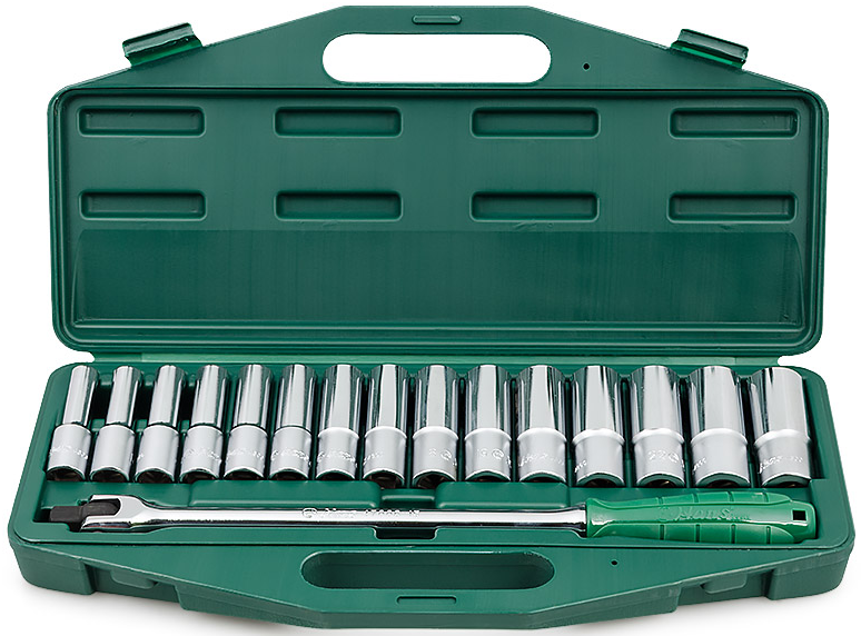 Набор торцевых удлиненных шестигранных головок Hans 4615MG в пластиковом кейсе из 16 предметов, применяется для монтажа/демонтажа крепежных элементов.