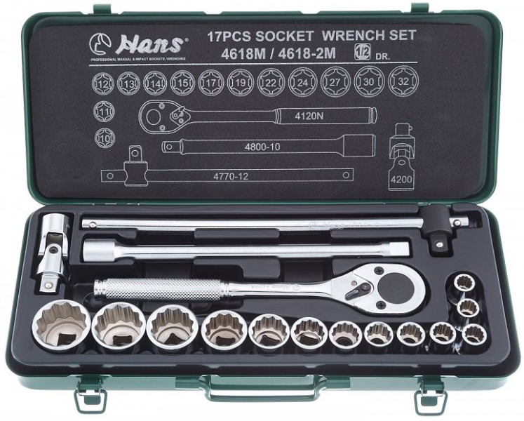 Набор двенадцатигранных торцевых головок Hans 4618-2M в металлическом кейсе из 17 предметов, применяется для монтажа/демонтажа крепежных элементов.