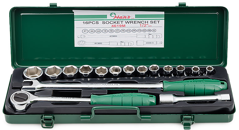 Набор шестигранных торцевых головок Hans 4619M в металлическом кейсе из 16 предметов, применяется для монтажа/демонтажа крепежных элементов.