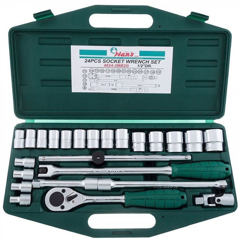 Набор двенадцатигранных торцевых головок Hans 4624-2MB2G в пластиковом кейсе из 24 предметов, применяется для монтажа/демонтажа крепежных элементов.