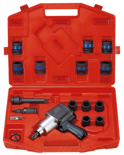 Комплектация: Гайковерт пневматический / ударные торцевые головки 19 / 24 / 27 / 29 / 30 / 32 / 33 / 34 / 35 / 36 / 38 / 41 мм / Ударный удлинитель 175 мм / Кардан шаровыйударный / Набор фиксаторов / Штуцер для быстросъемного подключения / Пластиковый кейс.