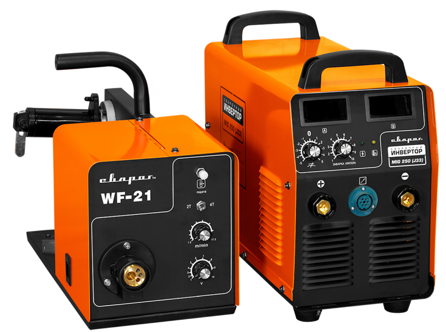 Сварочный инвертор Сварог MIG 250 F (J33) + WF21 (артикул 87774) предназначен для промышленной для механизированной сварки в среде защитных инертных и активных газов (MIG/MAG)