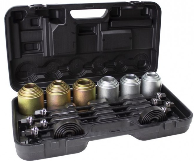 Универсальный набор инструментов Forsage F-933T1 в пластиковом кейсе из 26 предметов, предназначен для снятия и установки втулок, подшипников и сайлентблоков (М10, М12, М14, М16) используется для большинства марок автомобилей.