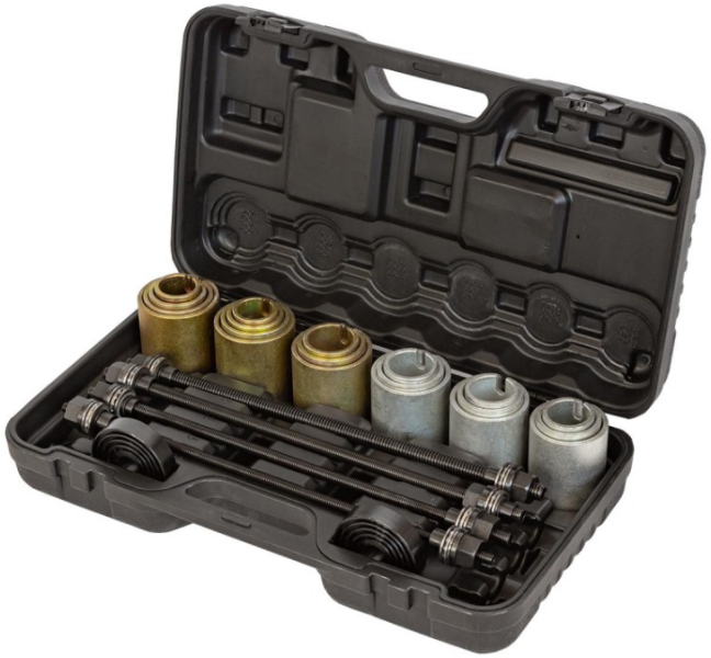 Набор универсальный Patron P-933T1 (код товара 51636) в пластиковом кенйсе из 26 предметов, используется для замены сайлентблоков, втулок и подшипников.