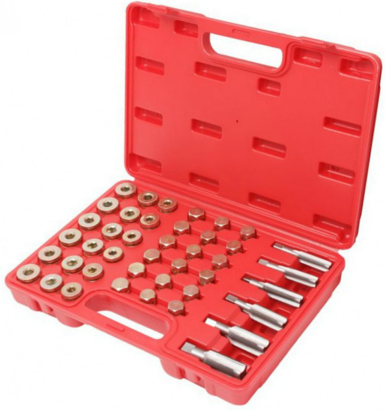 Комплект Forsage F-04A5038 в плаcтиковом кейсе из 42 предметов, предназначен для восстановления резьбы масло-сливных отверстий (М13х1.25, М13х1.5, М15х1.5, М17х1.5, М20х1.5, М22х1.5)