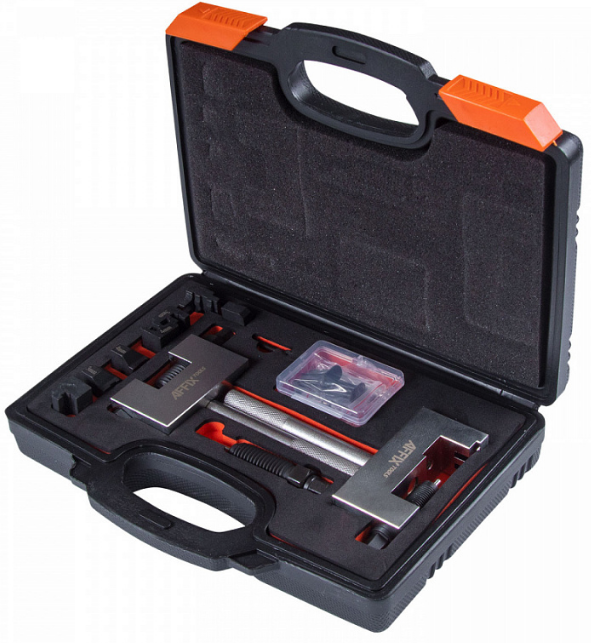 Набор для соединения/разъединения звеньев цепи ГРМ AFFIX AF10322022C в пластиковом кейсе из 22 предметов, используется для заклёпки и расклёпки звеньев цепи газораспределительного механизма автомобилей Mercedes-Benz.
