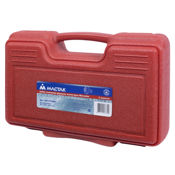 Съёмник дизельных форсунок для Mercedes-Benz в кейсе из 6 предметов Мастак 103-51006C применяется для демонтажа форсунок дизельных двигателей CDI Mercedes не прибегая к снятию головки блока цилиндров.