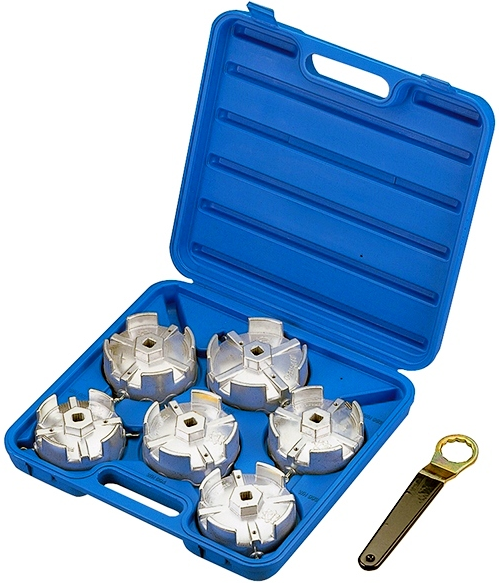 Набор съемников масляных фильтров Мастак 103-40007С в пластиковом кейсе из 7 предметов, предназначен для снятия или установки масляных фильтров двигателей большегрузных автомобилей.
