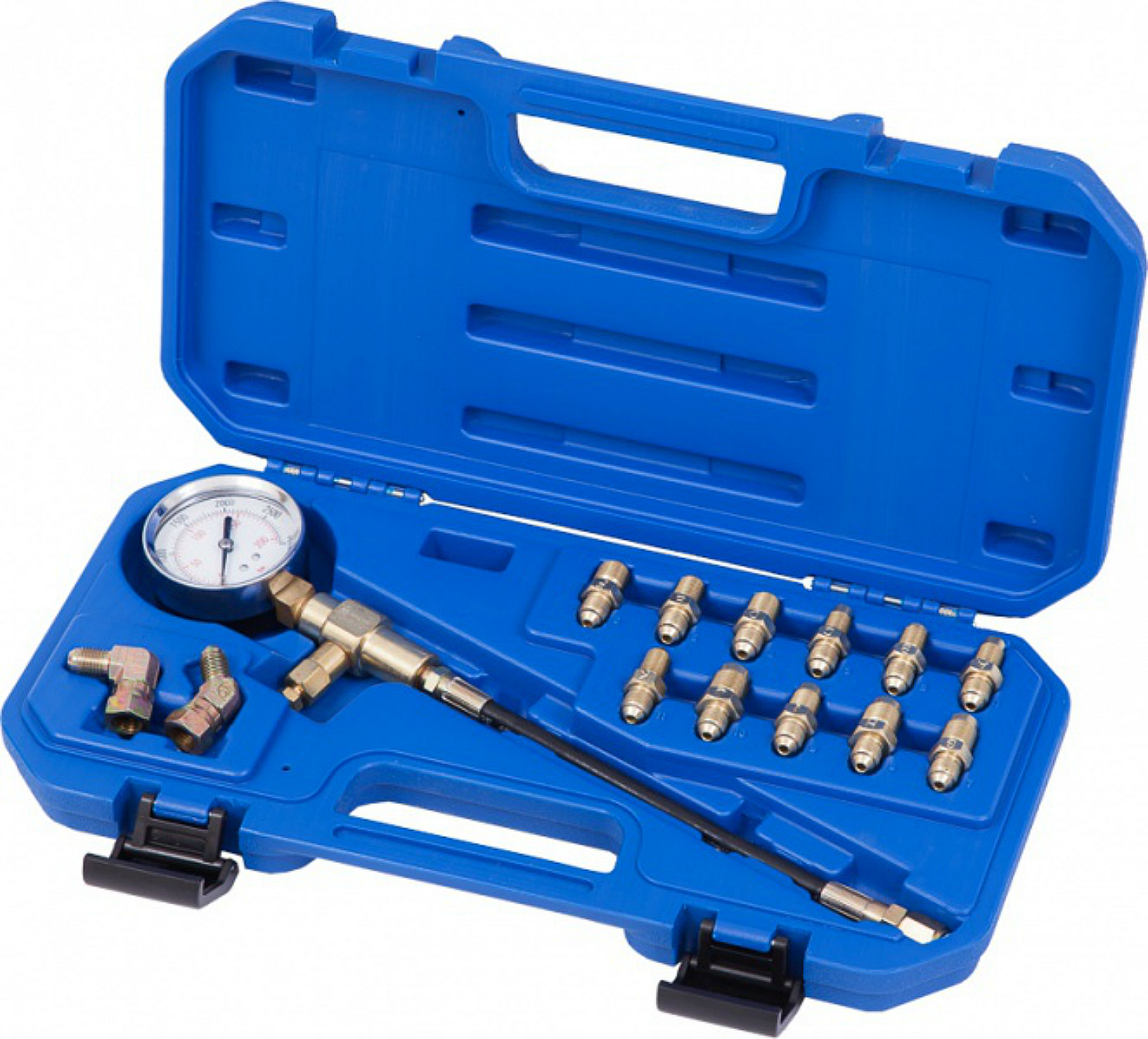 Манометр для измерения давления в тормозных системах Мастак 120-50024C в пластиковом кейсе из 14 предметов, предназначен для профессиональной диагностики состояния тормозной системы и для проверки состояния гидравлического сцепления автомобилей.