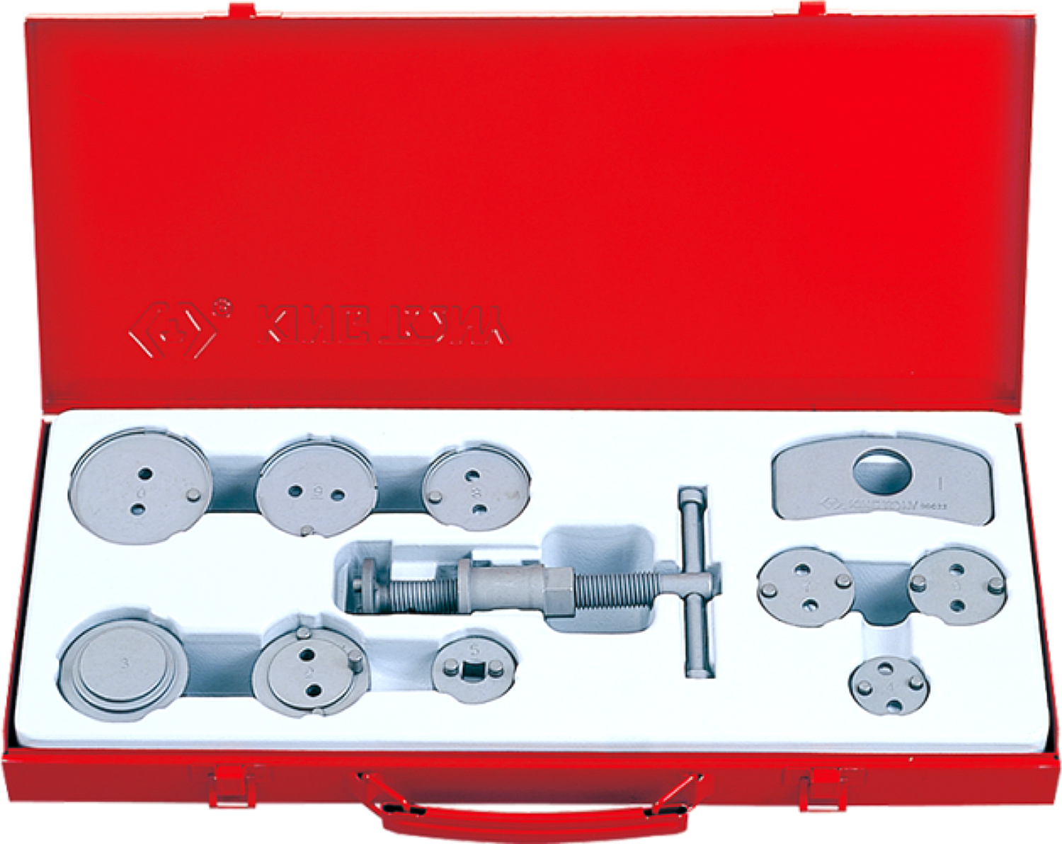Набор для утапливания поршней суппортов дисковых тормозов King Tony 9BC22 в металлическом кейсе из 11 предметов, предназначен для выполнения работ по техническому обслуживанию и ремонту тормозных систем автомобилей марок VW, Audi, Ford, Nissan, Alfa Romeo, Rover, Saab, Subaru, Toyota, Jaguar и большинства моделей General Motors. Производитель: King Tony / Кинг Тони (Тайвань)