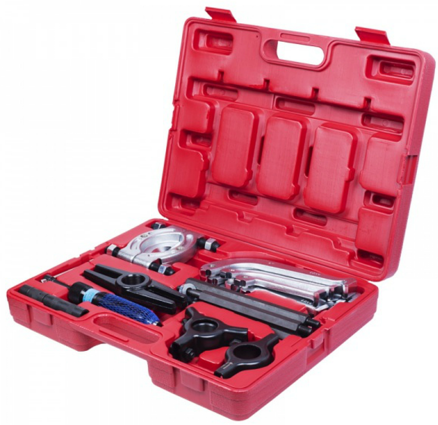 Съемник подшипников гидравлический Мастак 104-19010C в пластиковом кейсе из 17 предметов, предназначен для демонтажа подшипников, шкивов, шестерен и других деталей автомобилей.