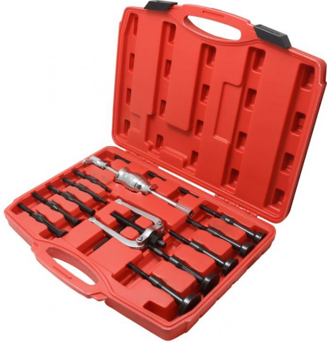 Набор съемников внутренних подшипников цанговый с обратным молотком Forsage F-915T1 (код товара 5132) в пластиковом кейсе из 16 предметов, используется для подшипников с внутренним диаметром 8-34 мм.