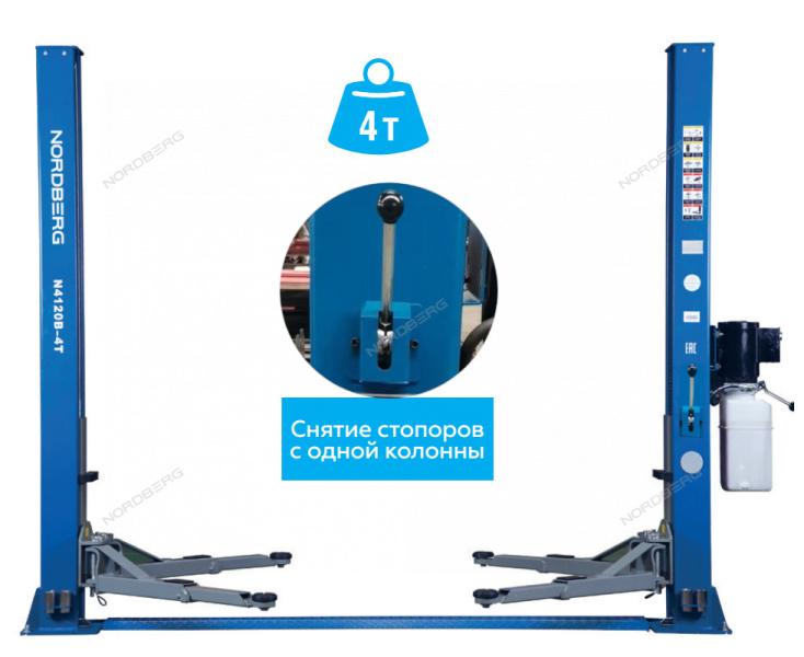 Электрогидравлический двухстоечный подъемник Nordberg N4120BM-4B_220V с cимметричной конструкцией лап с низким подхватом и эллектронным управлением.