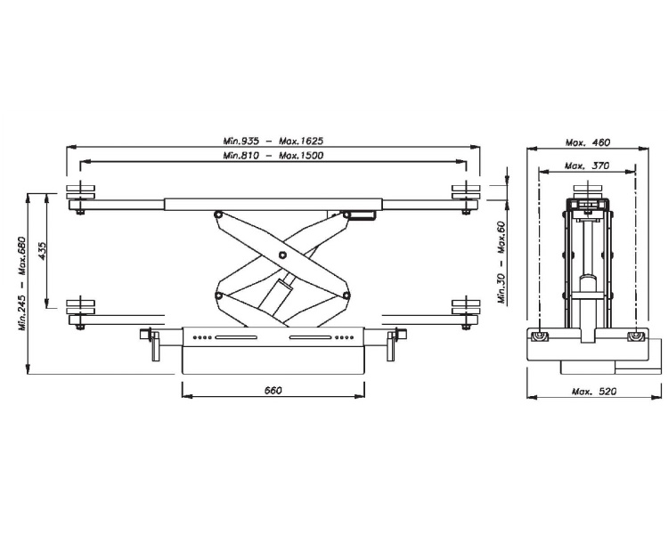 • Максимальный уровень подъема составляет 575 мм, дает возможность в комфортных условиях проводить осмотр авто и совершать необходимые операции.